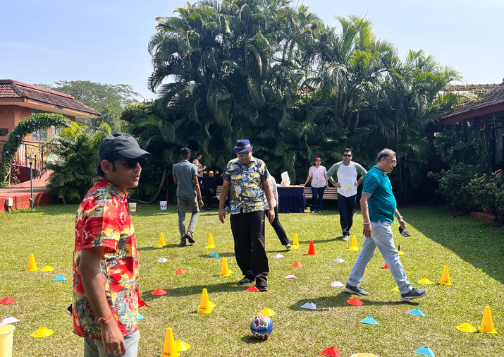 Blindfolded participants must navigate an obstacle-filled field while relying on their teammates’ verbal instructions, emphasizing trust and communication.